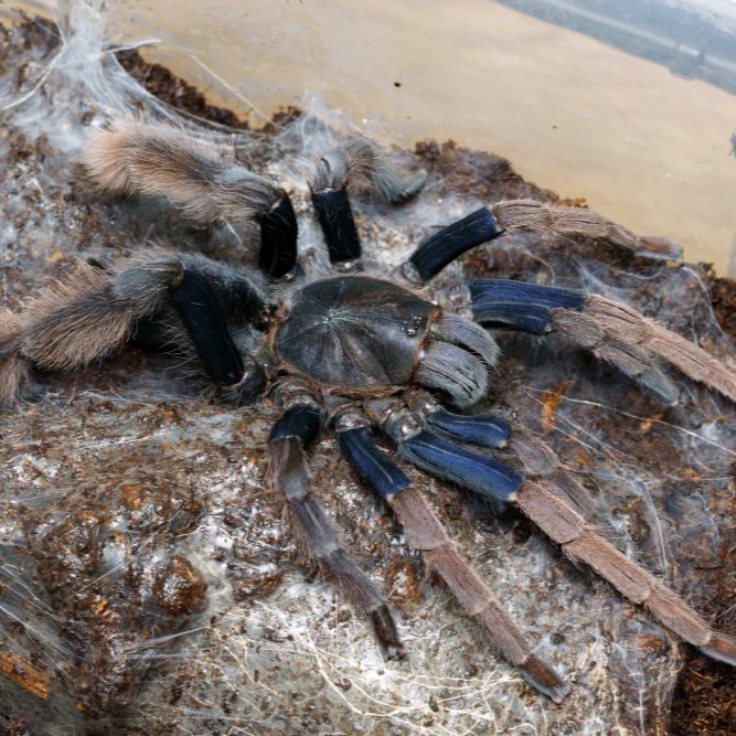 • Vivid Coloration: This species is a showstopper post-molt. While the body is a deep, rich espresso or charcoal, the femurs of all eight legs display a breathtaking metallic purple-to-lavender sheen that shimmers under direct light.